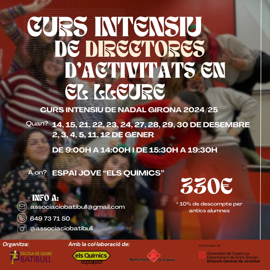 Un any més, l'Associació Batibull, amb la col·laboració d'Els Químics, es complau a organitzar un curs intensiu de directors d'activitats de lleure que se celebrarà a Girona, Espanya, del 14 al 30 de desembre de 2024. Èxit de l'edició anterior i millores per a 2024 Després de l'èxit de l'edició anterior, estem molt il·lusionats de poder tornar a oferir aquesta [...]